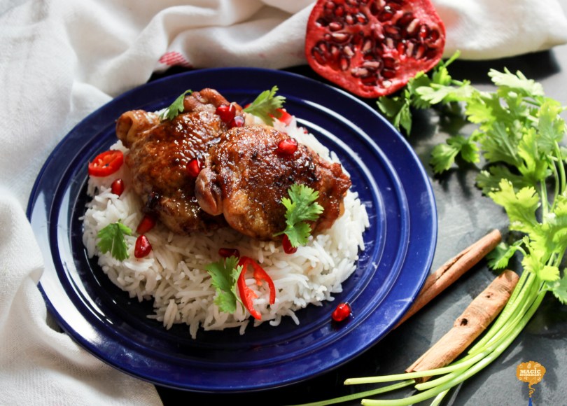 I honestly don’t now how I got inspired to make this version of chicken. I had been wanting to use pomegranate on chicken for some time. Once I got the two ingredients, I wanted the red hues of the pomegranate to shine. And I kept adding ingredients which are red in color – red wine and paprika. Bringing in a red themed party with some wine thrown in too. It’s a sweet spicy chicken with hints of cinnamon. Here’s a toast to the magic ingredient of pomegranate.
