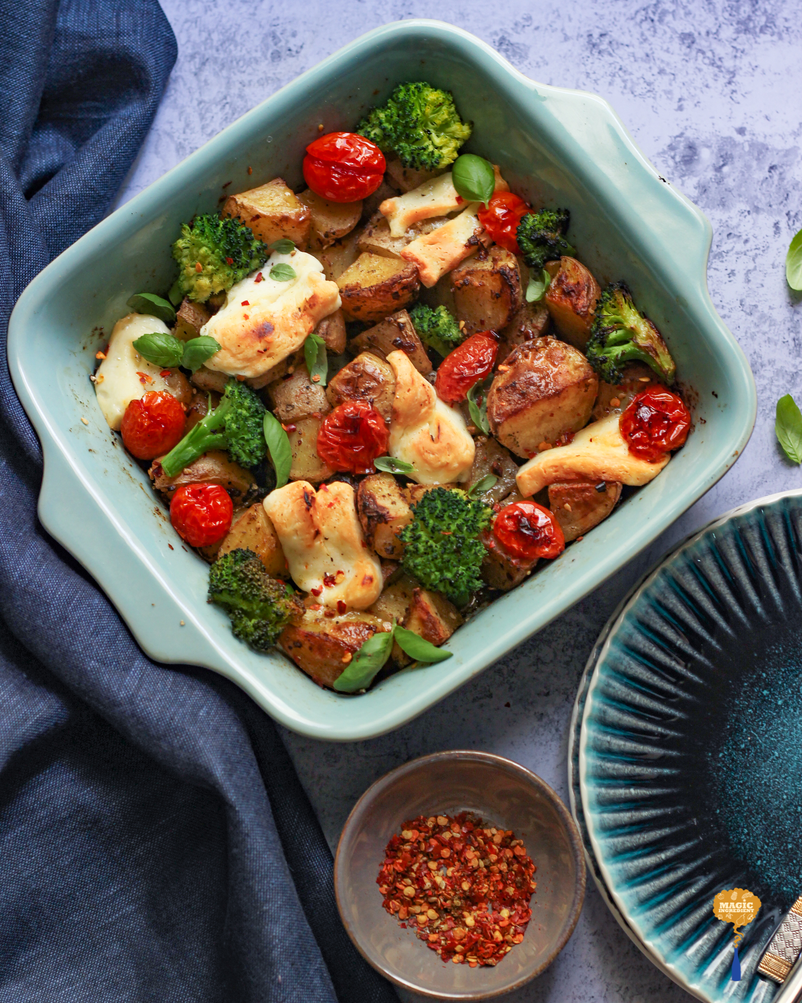 As the temperature in Dubai is on a downward trend, I needed something comforting to start the week. Baked potatoes are a family favorite, and I wanted to add a twist to make it enjoyable. So I brought in the middle-eastern twist to this classic. Zaatar and halloumi baked potatoes is a delicious one-pan meal.
