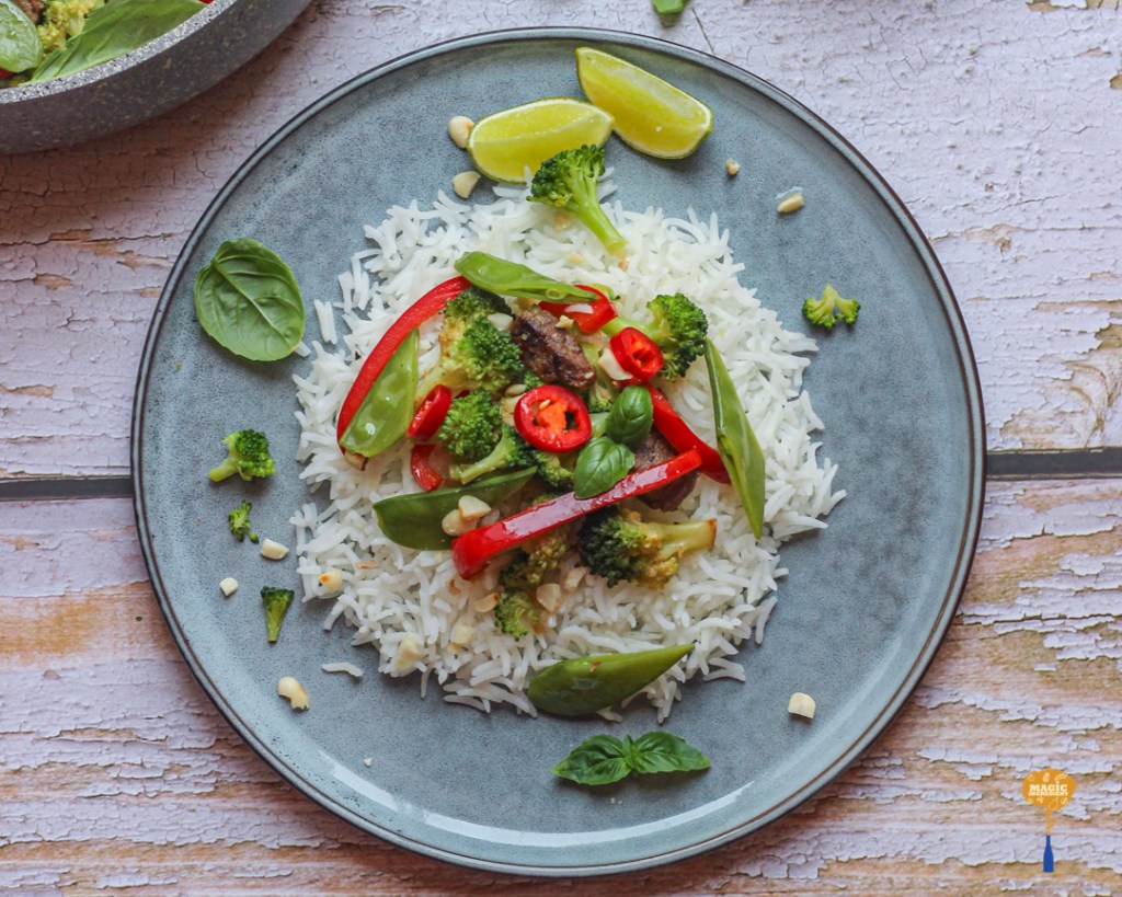 Thai Basil beef is a stir fry of healthy ingredients and beef strips. A handful of ingredients leads to a colorful vibrant dish. You can switch beef with chicken to keep it light.