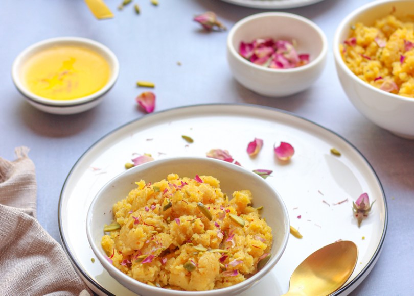 Dried rose petals and pistachios add to the texture and taste. I hope you do make this halwa for one of the festive occasions coming soon. Nothing like a bowl of piping hot halwa loaded with clarified butter and nuts.