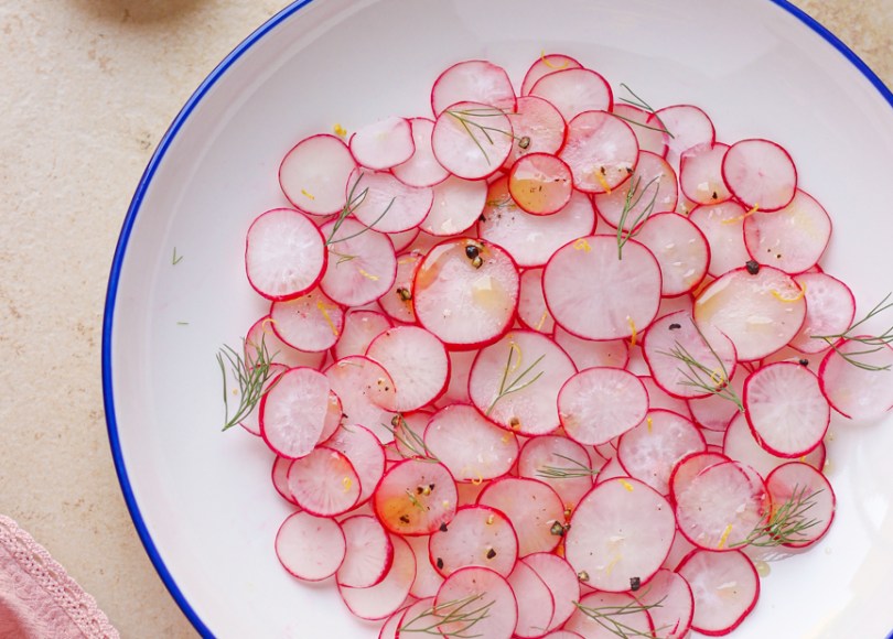 Table red radish, which is readily available and cheap, is perfect for this recipe. The dressing is a sweet lemony vinaigrette to balance the sharpness of radish. You may use a mandoline slicer or a sharp knife to get the paper thin slices.