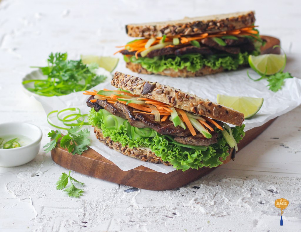 It takes a little longer than any average sandwich, but I recommend it. You can add your choice of protein or tofu. The vegetables, herbs, and sauces make it a summer delight. It is like summer comfort food minus the guilt.