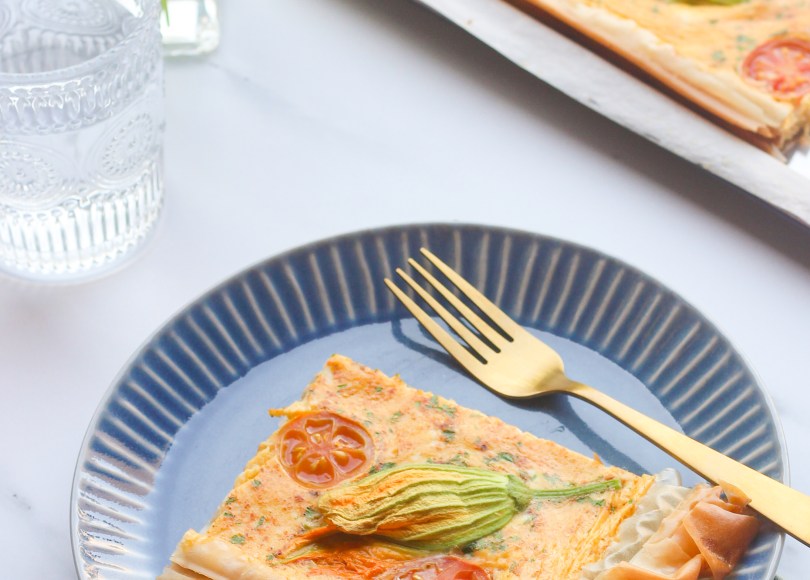 This year we harvested just one giant pumpkin from our tiny garden. Nevertheless, we look forward to the harvests every year, but I love the add-ons we get from these plants. The edible male flowers are an absolute delight. Toss them into a salad or batter-fry them. They turn out just delicious. This year I decided to create something unique. I stuffed them with cheese, herbs, and spices and baked them with eggs. Stuffed squash blooms frittata tart was one of a kind. It turned out great with crispy filo sheets as a base.