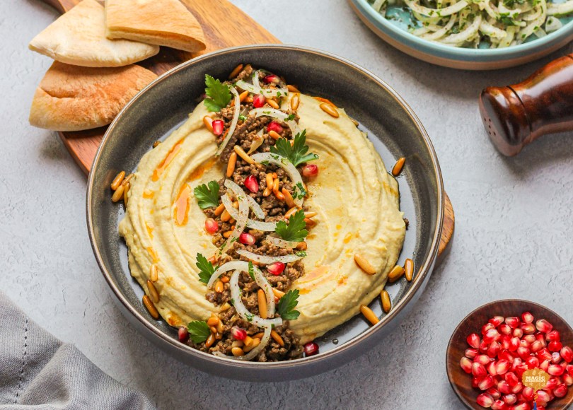 - Start by plating the hummus, and the meat can be served on the side or top. Garnish with parsley, pinenuts, and pomegranate arils. Serve with warm pita bread.